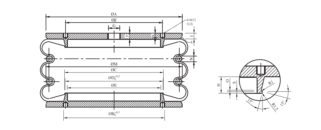 活套式橡胶空气弹簧(HF型)结构: 1、密封端板(不包含组件)于产品配合面平整光滑,此板应有足够强度在承受载荷时不会弯曲变形。 2、法兰环:采用铝制或钢制 3、空气弹簧:自身具有..